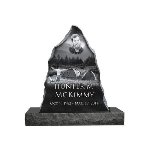 A custom-shaped granite memorial featuring an engraved portrait and outdoor mountain scene, honoring a life of adventure and lasting memories.