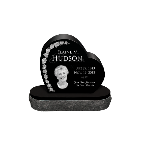 An elegant heart-shaped granite memorial with floral detailing and a portrait engraving, honoring a cherished life with grace and love.